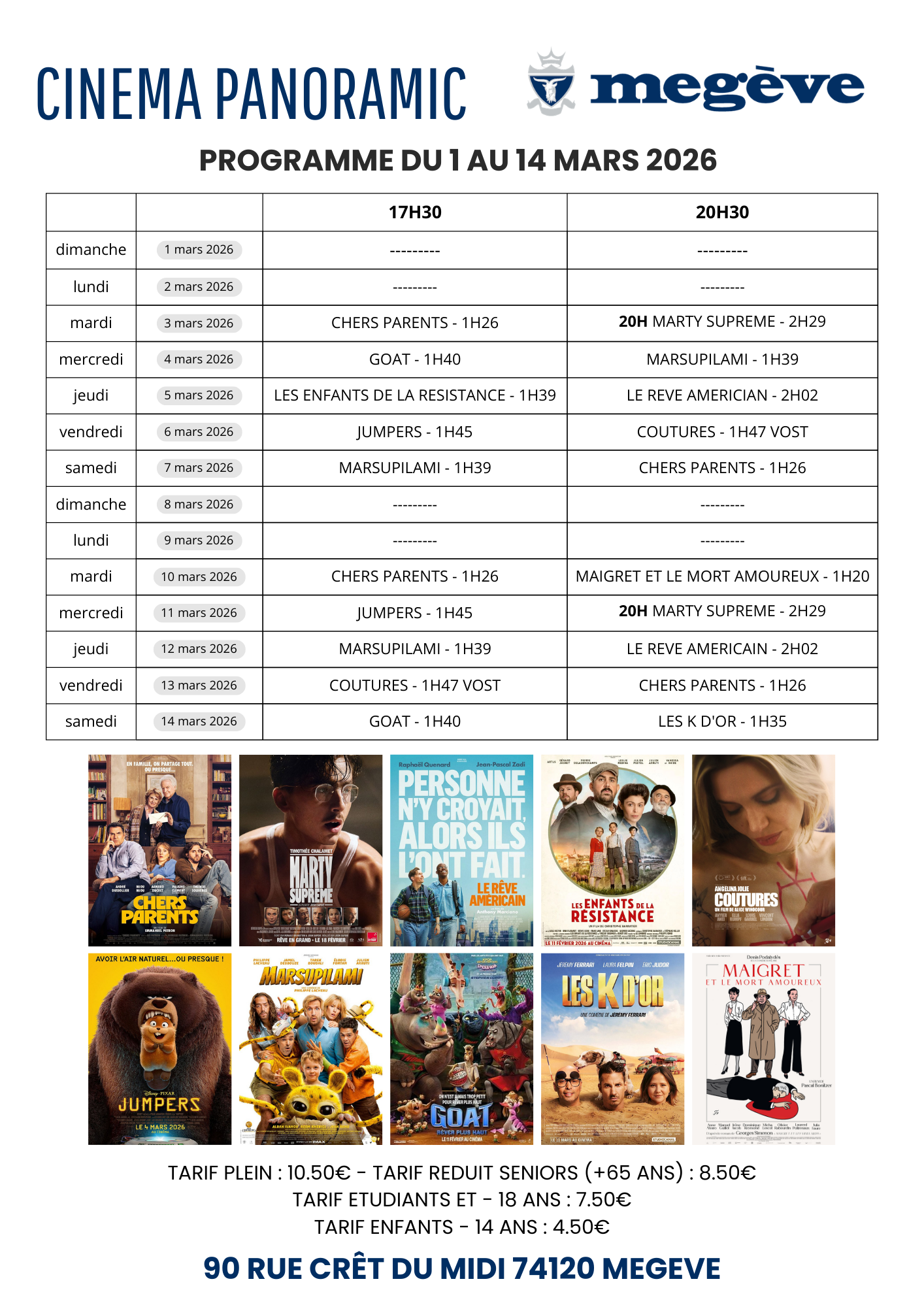 Jusqu'au printemps nous ne vendrons plus de tickets de cinéma. Directement à la caisse du PANORAMIC, Megève, vous bénéficierez d'un tarif adultes à 7,50 € sur présentation de votre carte d'adhésion.